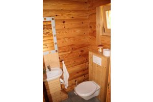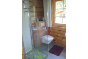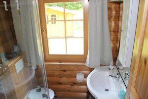 Badezimmer: Dusche, WC, Waschbecken, Föhn, Handtücher